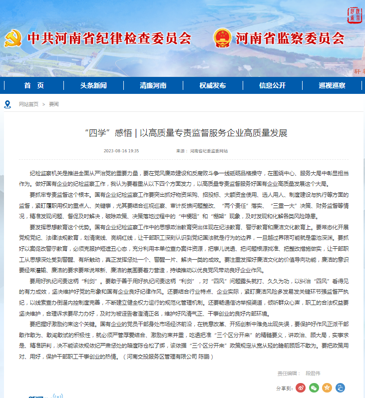 省紀委監(jiān)委網(wǎng)站刊登服務(wù)區(qū)公司文章 《以高質(zhì)量專責監(jiān)督服務(wù)企業(yè)高質(zhì)量發(fā)展》