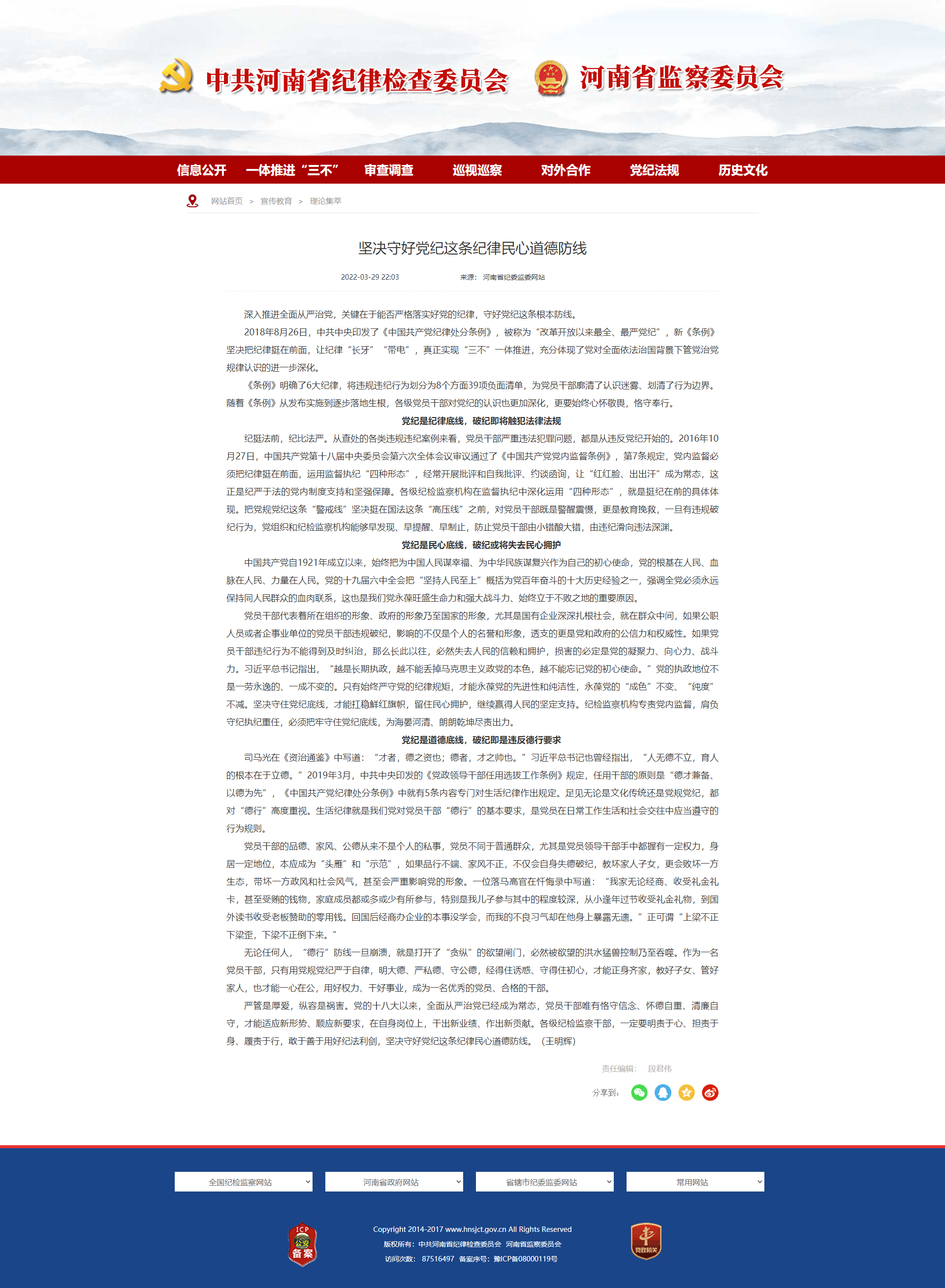 來源: 本站 發(fā)布時間: 2022-03-303月29日,河南省紀(jì)委監(jiān)委網(wǎng)站宣傳教育板塊理論集萃專欄刊載服務(wù)區(qū)公司《堅決守好黨紀(jì)這條紀(jì)律民心道德防線》工作信息。