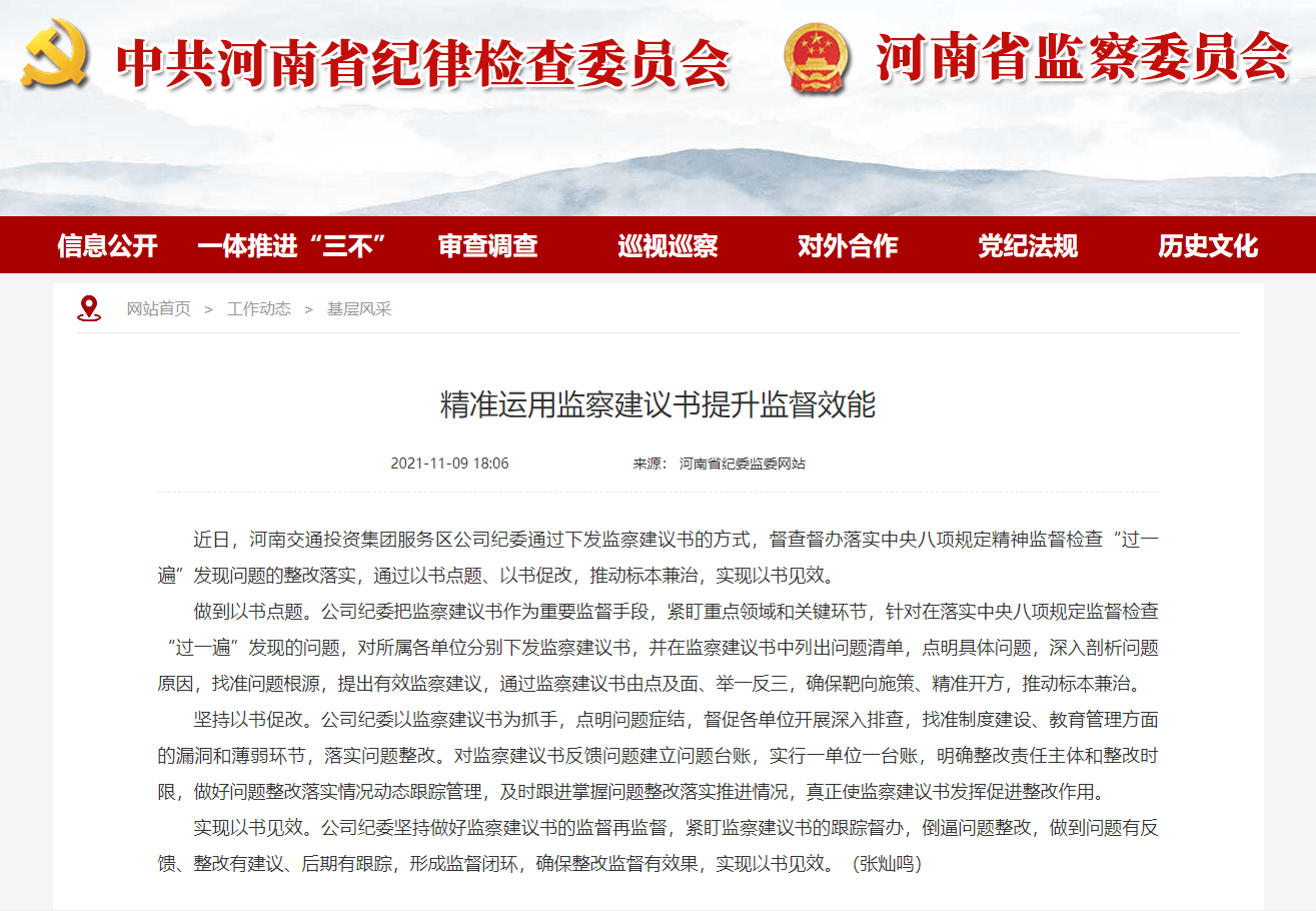 來(lái)源: 本站 發(fā)布時(shí)間: 2021-11-1111月9日,省紀(jì)委監(jiān)委外網(wǎng)首頁(yè)工作動(dòng)態(tài)基層風(fēng)采專欄刊載公司紀(jì)委題為《精準(zhǔn)運(yùn)用監(jiān)察建議書提升監(jiān)督效能》的工作信息。公司紀(jì)委把監(jiān)察建議書作為重要監(jiān)督手段,以監(jiān)察建議書為抓手,督查督辦落實(shí)中央八項(xiàng)規(guī)定精神監(jiān)督檢查“過(guò)一遍”發(fā)現(xiàn)問(wèn)題的整改落實(shí),通過(guò)以書點(diǎn)題、…