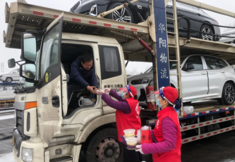 1月22日上午,因道路交通管制,造成三門峽服務(wù)區(qū)南區(qū)大量車輛滯留,服務(wù)區(qū)黨員干部想顧客之所急,免費(fèi)為司乘人員送去愛心早餐,深受司乘人員好評(píng)。賈松鶴 攝