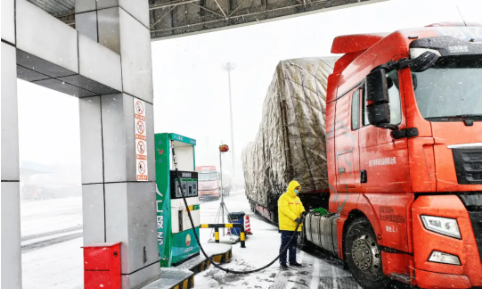 1月23日,三門峽加油站冒雨雪為貨運(yùn)車輛提供加油服務(wù) 邢佛曉 攝