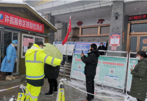 1月23日,許昌服務(wù)區(qū)雪中堅(jiān)守崗位,維持核酸檢測(cè)點(diǎn)秩序,幫助引導(dǎo)操作核酸檢測(cè)點(diǎn)流程 劉雪嶺 攝