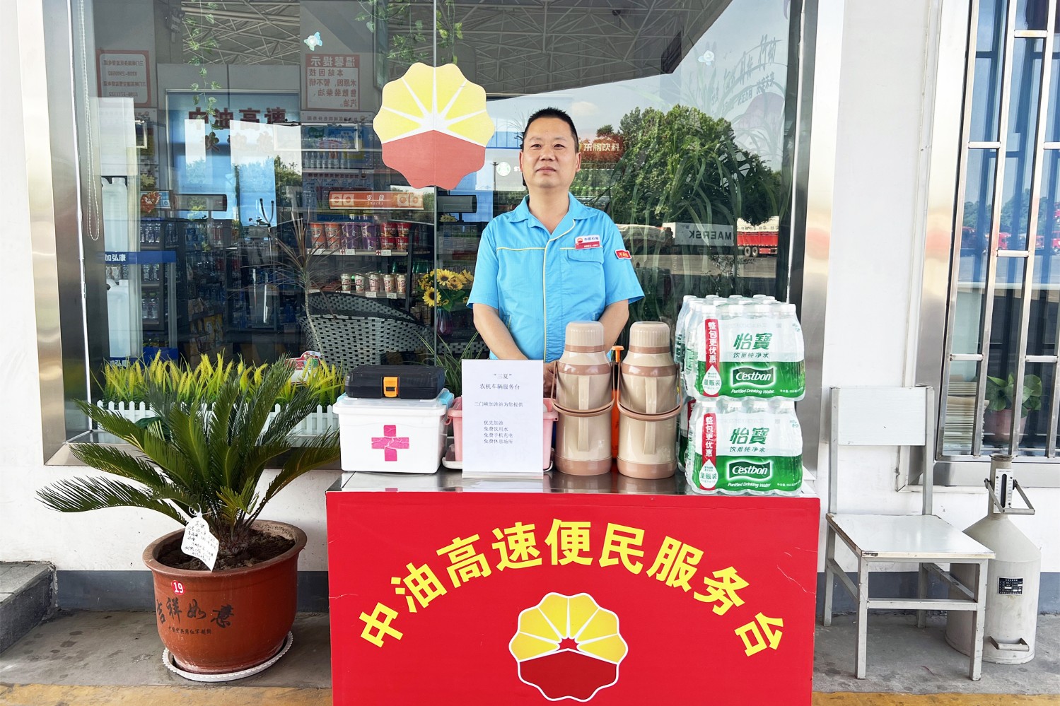 二是公司服務(wù)區(qū)、加油站嚴格落實“三夏”服務(wù)保障政策,設(shè)立“三夏”生產(chǎn)服務(wù)臺, 免費提供應(yīng)急藥品、綠豆水、降溫茶、維修工具等;為運輸車輛提供“三優(yōu)先”(優(yōu)先加油、休息和檢修),“三免費”(免費加水充氣、洗澡和洗衣服),“一優(yōu)惠”(就餐享受 8 折優(yōu)惠)等服務(wù);加油站積極開展“三夏”優(yōu)惠活動,全線加油站柴油價格在掛牌價基礎(chǔ)上直降0.5元/升,全力減輕農(nóng)戶成本負擔(dān);開辟綠色加油通道,設(shè)立專用加油機位,確保24小時油品供應(yīng)充足,全力做好服務(wù)保障工作。