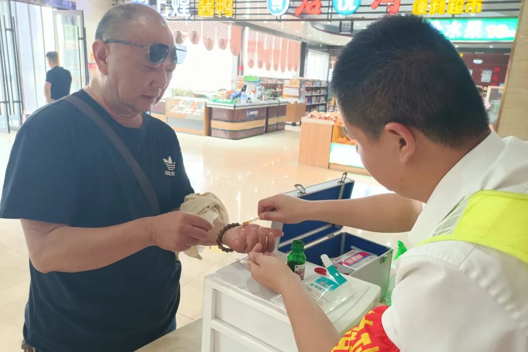 6月8日,封丘服務(wù)區(qū)為受傷司乘涂抹碘酒消毒