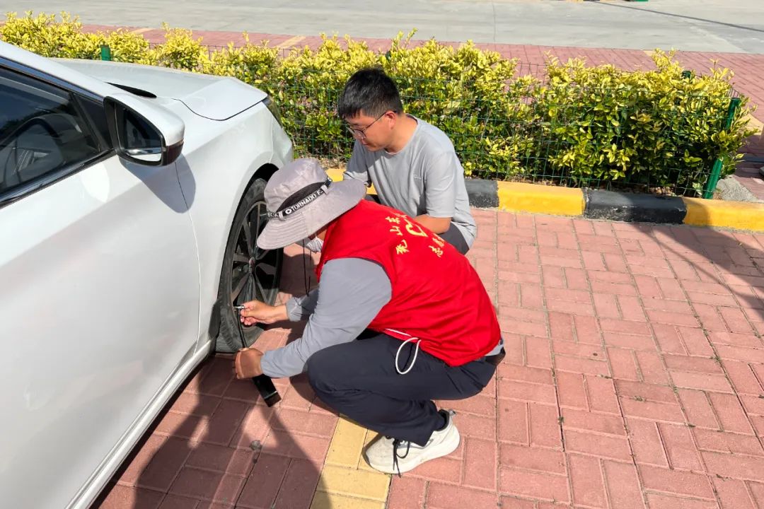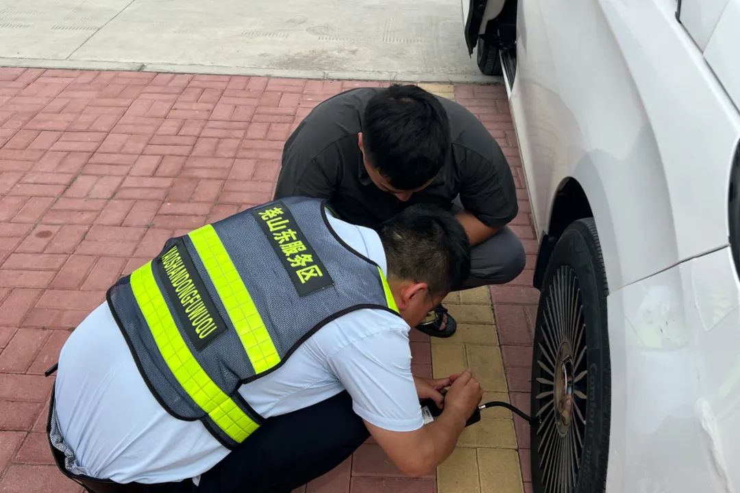 6月9日,堯山東服務(wù)區(qū)工作人員為故障車輛提供免費充氣服務(wù)