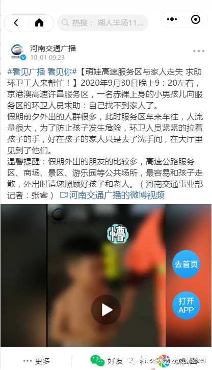10月01日,大象網(wǎng)、微博視頻·河南交通廣播以題為《看見廣播 看見你——萌娃高速服務(wù)區(qū)與家人走失 求助環(huán)衛(wèi)工人來幫忙!》對(duì)所屬許昌服務(wù)區(qū)好人好事進(jìn)行了報(bào)道。