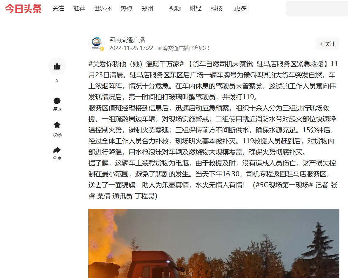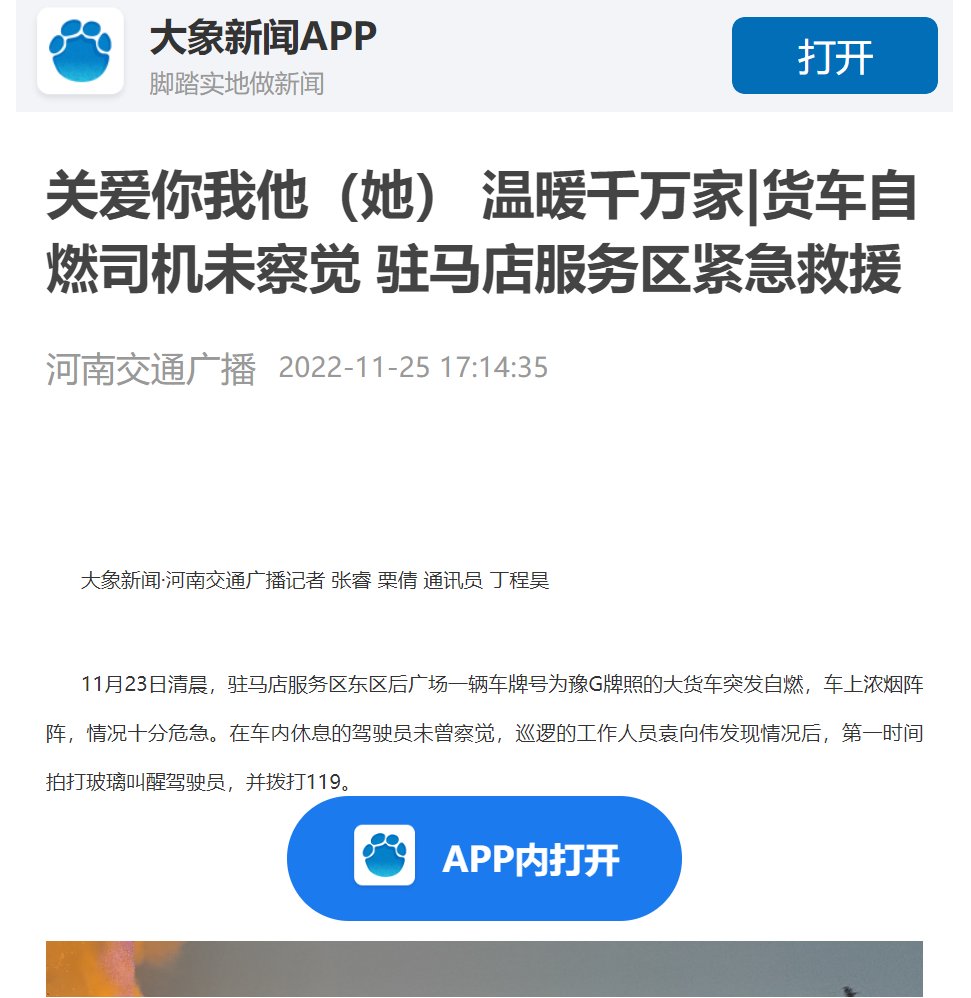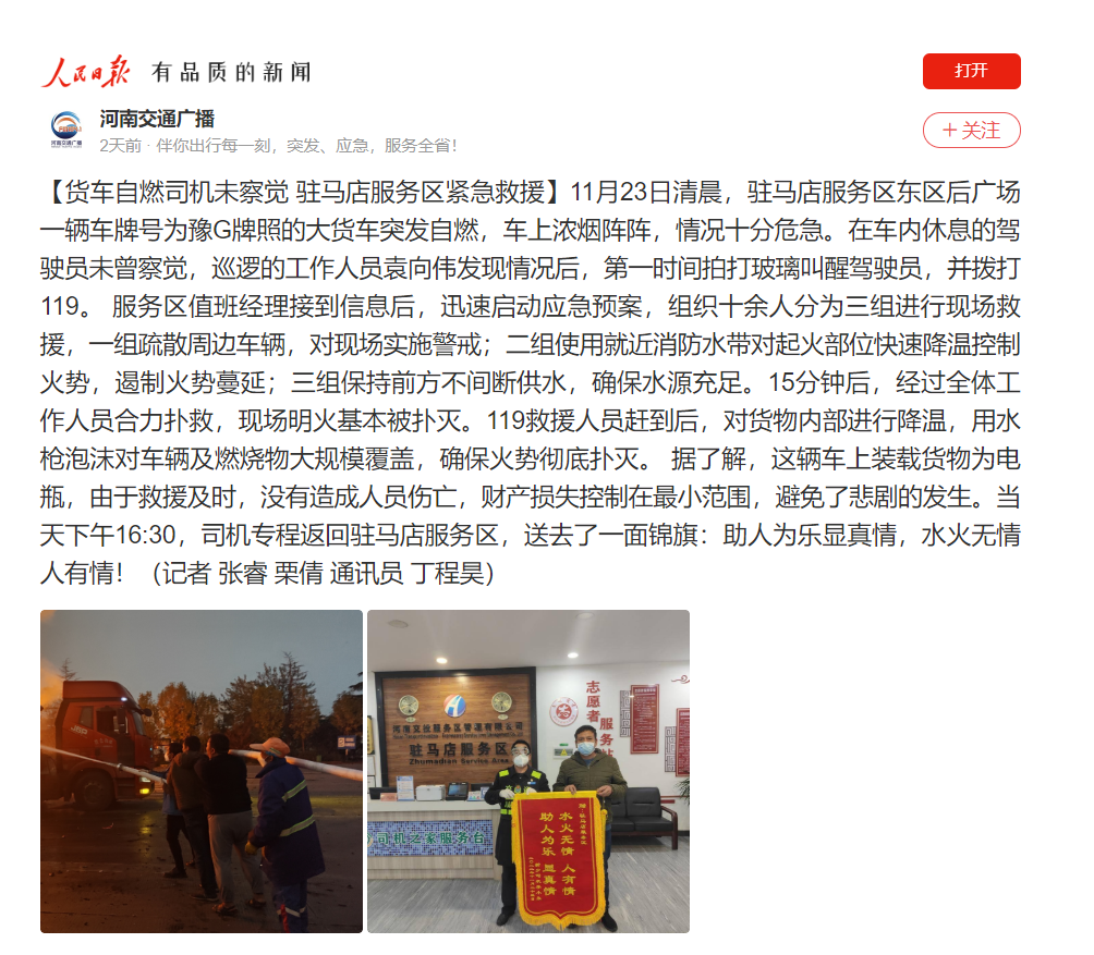 2022年11月25日,人民日報、今日頭條、微博、大象新聞以《貨車自燃司機未察覺 駐馬店服務(wù)區(qū)緊急救援》圖片新聞的形式對服務(wù)區(qū)公司駐馬店服務(wù)區(qū)妥善處置貨車自燃事故進行了報道。