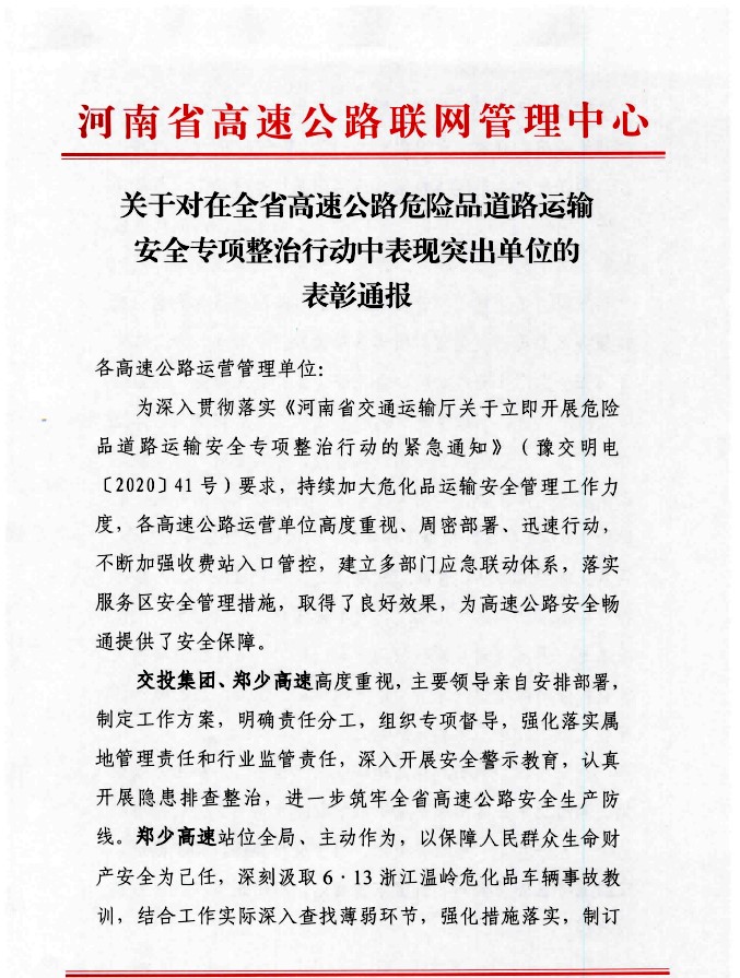 來源: 本站 發(fā)布時間: 2020-07-02近期,公司在全省高速公路危險品道路運(yùn)輸安全專項(xiàng)整治活動中表現(xiàn)突出,省高速公路聯(lián)網(wǎng)管理中心對公司高度重視、周密部署,多舉措抓好抓實(shí)安全生產(chǎn)工作,給予了充分肯定,并對交投集團(tuán)、公司及所屬鄭州北服務(wù)區(qū)全省通報表彰! 6月24日,河南省政府副省長、省公安廳廳長舒慶一行…