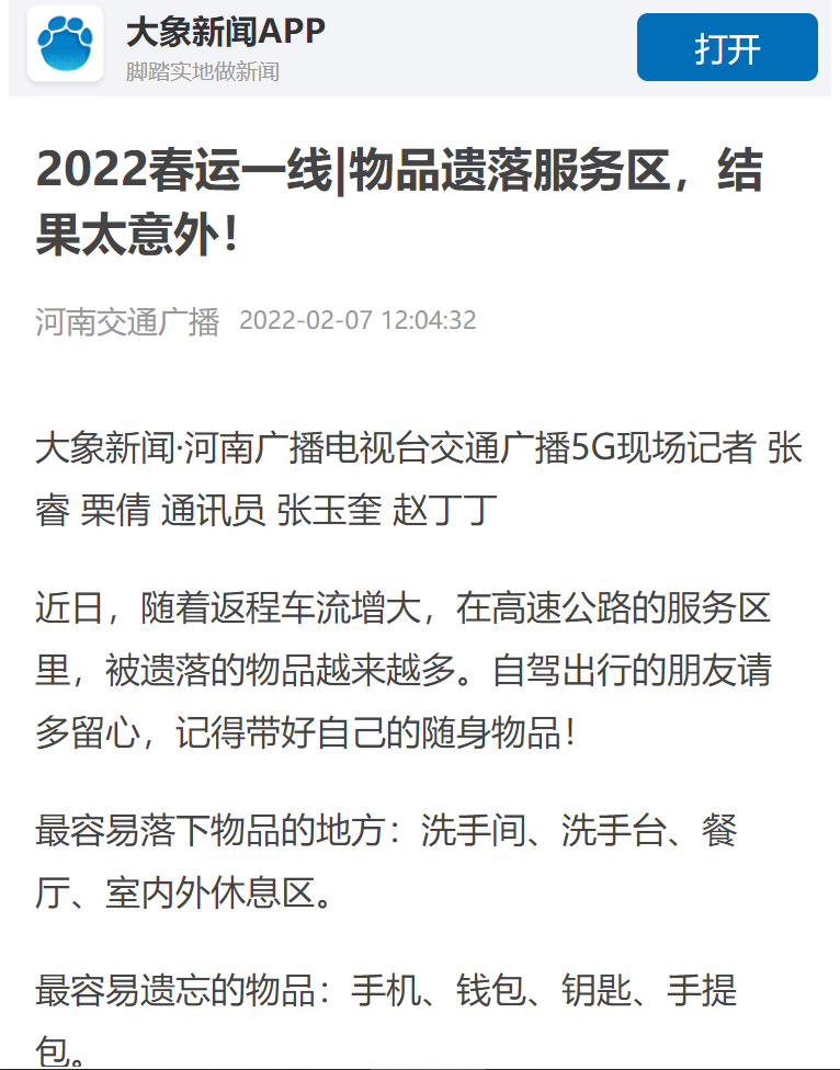 來(lái)源: 本站 發(fā)布時(shí)間: 2022-02-072月7日,“河南交通廣播”、今日頭條、“河南交通廣播”新浪微博官方號(hào)等媒體以“2022春運(yùn)一線|物品遺落服務(wù)區(qū),結(jié)果太意外!”為題,對(duì)公司所屬服務(wù)區(qū)春節(jié)期間溫馨服務(wù)進(jìn)行宣傳報(bào)道。點(diǎn)擊原文:https://share.hntv.tv/news/0/1490536932762804226https://www.toutiao.com/i70…
