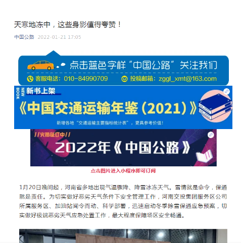 來源: 本站 發(fā)布時間: 2022-01-211月21日,“中國公路”微信公眾號 以“天寒地凍中,這些身影值得夸贊!”為題,對公司所屬服務區(qū)、加油站積極開展雨雪天氣防護工作進行了宣傳報道。網(wǎng)址:https://mp.weixin.qq.com/s/fr2d-9a02z-FJr7X5Qn1MA 截圖:1月21日,“中國公路網(wǎng)”以“以雪為令,除雪保暢 為公眾出行…