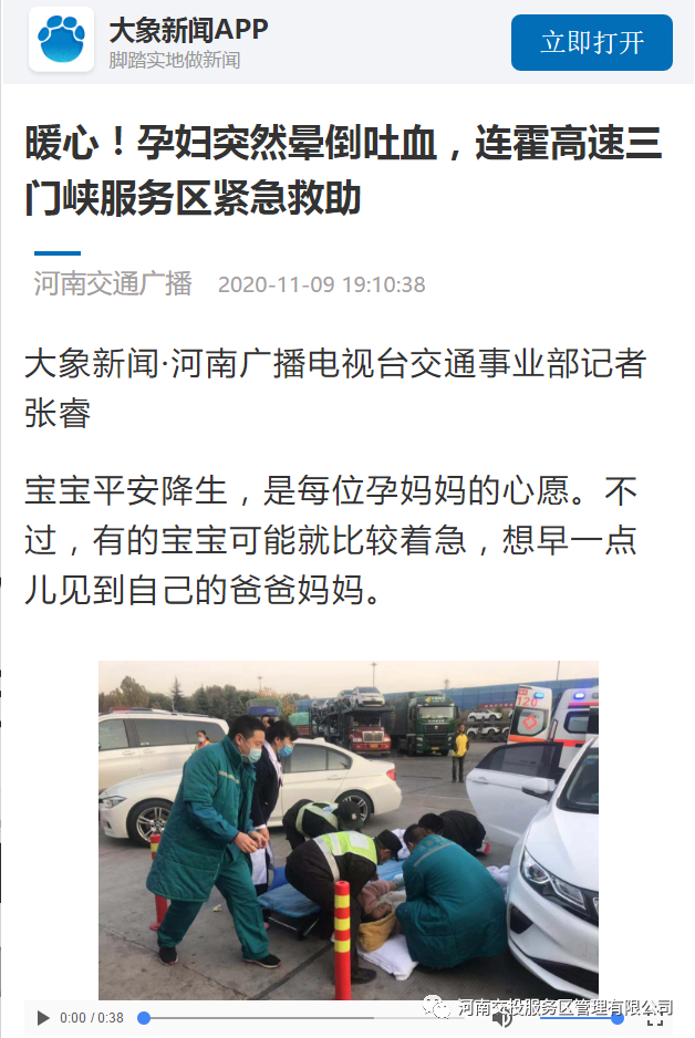 大象新聞、河南交通廣播電臺:暖心!孕婦突然暈倒吐血,連霍高速三門峽服務區(qū)緊急救助