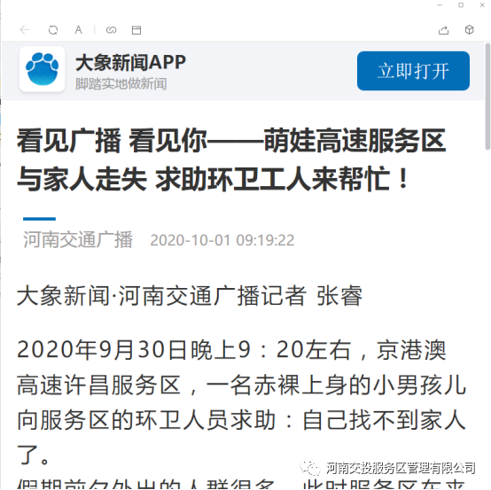 大象網(wǎng)、微博視頻·河南交通廣播:看見廣播 看見你——萌娃高速服務(wù)區(qū)與家人走失 求助環(huán)衛(wèi)工人來幫忙!