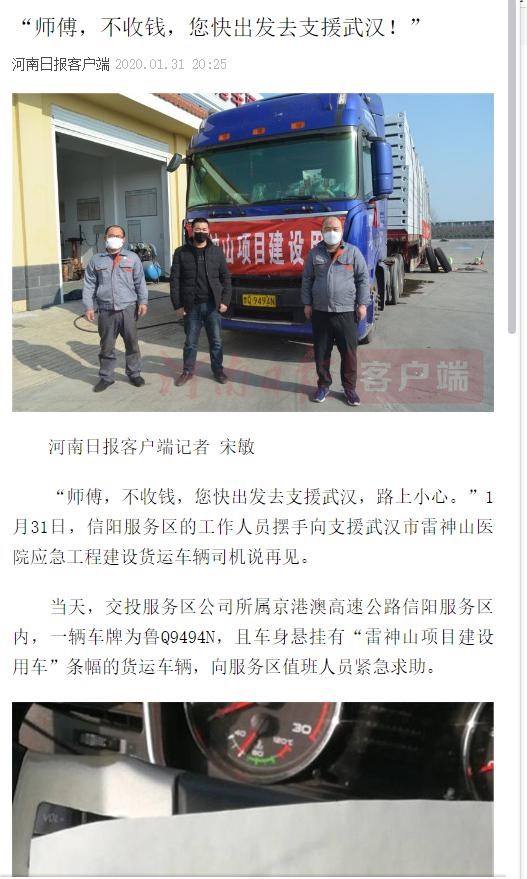來源: 本站 發(fā)布時(shí)間: 2020-02-01猛犸新聞:《“不收錢,您快支援武漢!”雷神山物資車求助信陽服務(wù)區(qū)來幫忙》 2020-01-31 19:23:09猛犸新聞東方今報(bào)首席記者夏萍以題為《“不收錢,您快支援武漢!”雷神山物資車求助信陽服務(wù)區(qū)來幫忙》對(duì)交投服務(wù)區(qū)公司所屬信陽服務(wù)區(qū)服務(wù)保障支援武漢物資車輛進(jìn)行了報(bào)道。 網(wǎng)…