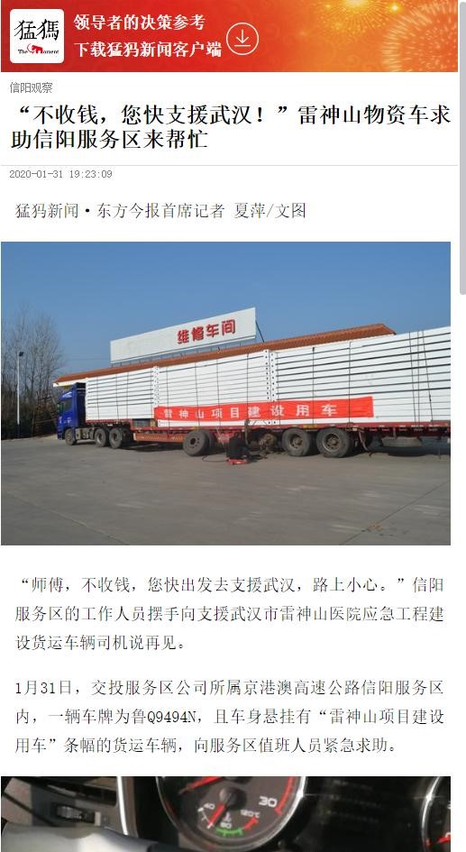 猛犸新聞:《“不收錢,您快支援武漢!”雷神山物資車求助信陽服務(wù)區(qū)來幫忙》