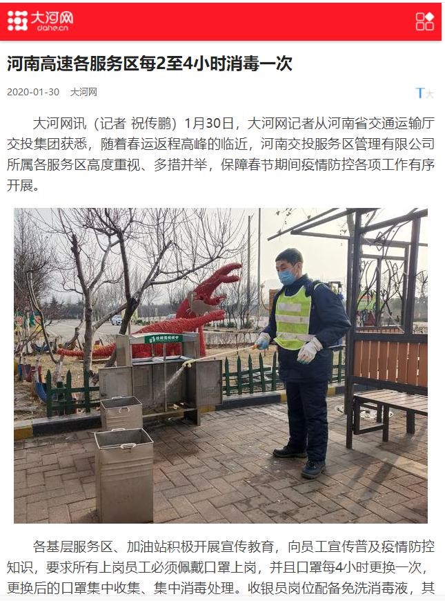 大河網(wǎng):《河南高速各服務(wù)區(qū)每2至4小時(shí)消毒一次》