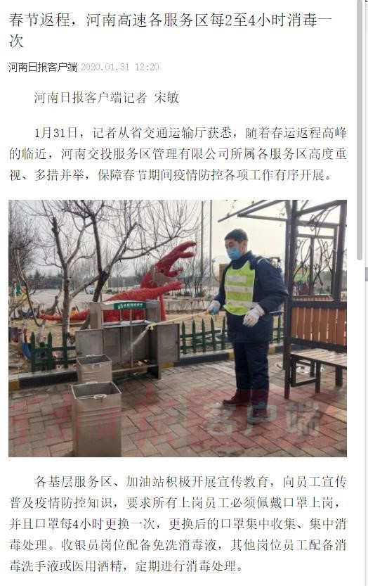 河南日?qǐng)?bào):《春節(jié)返程,河南高速各服務(wù)區(qū)每2至4小時(shí)消毒一次》