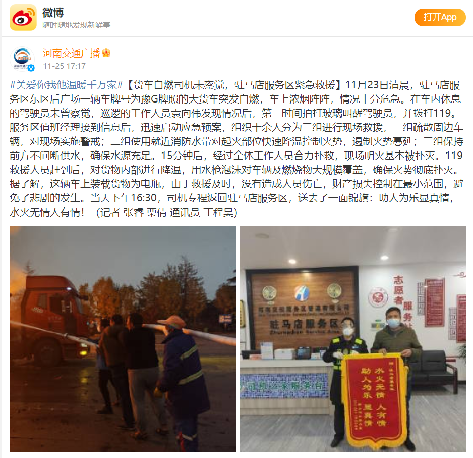 人民日?qǐng)?bào)、今日頭條、微博、大象新聞:貨車自燃司機(jī)未察覺(jué) 駐馬店服務(wù)區(qū)緊急救援(改)
