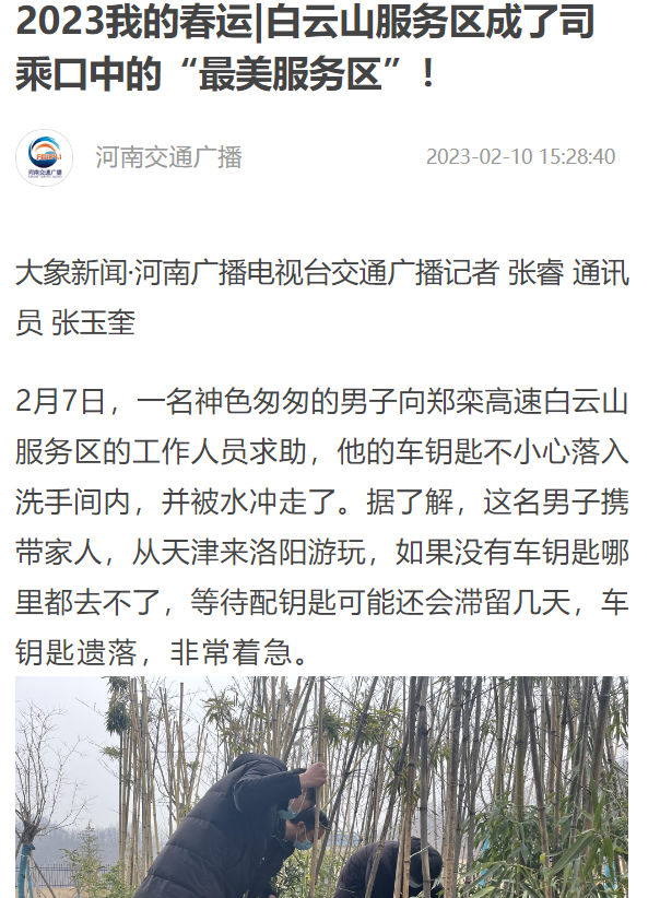 大象新聞、今日頭條、河南交通廣播:2023我的春運(yùn)|白云山服務(wù)區(qū)成了司乘口中的“最美服務(wù)區(qū)”?。ǜ模?/p>