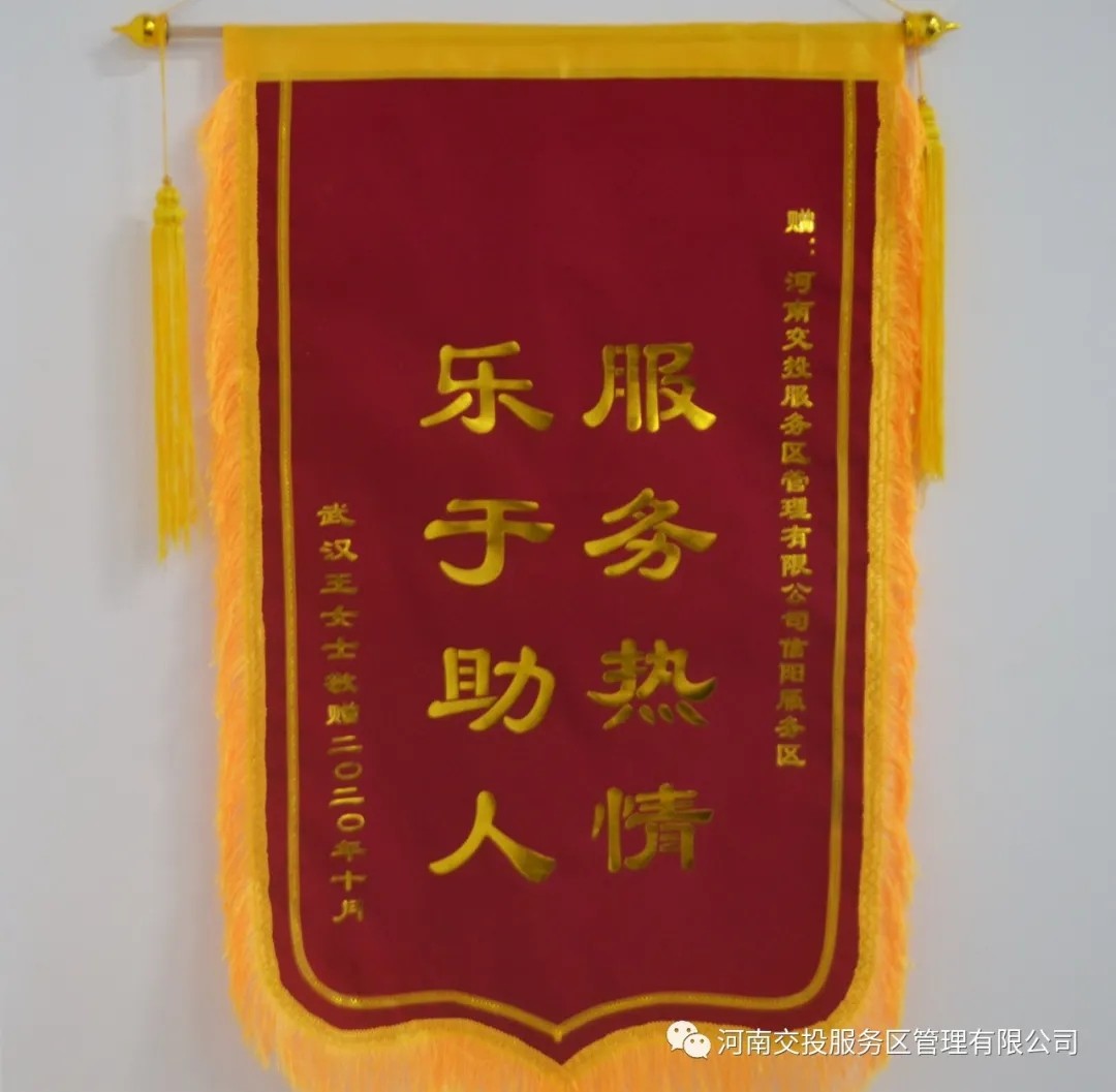 2020-10-14 作者:“信陽服務(wù)區(qū)急乘客所急,因工作原因無法親自送達,只能郵寄,為你們的熱心服務(wù)點個贊!”10月14日,信陽服務(wù)區(qū)收到一面由武漢王女士寄來的寫有“服務(wù)熱情 樂于助人”的錦旗。原來10月8號下午,正值雙節(jié)假期返程高峰,王女士帶著兩個孩子開車途徑信陽服務(wù)區(qū)停歇時,不慎將車鑰…