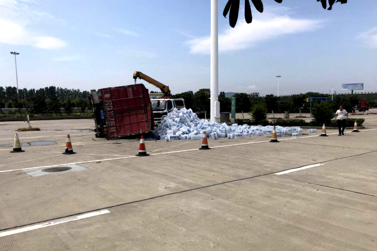 6月10日,一輛滿載瓶裝水的中型貨車駛?cè)肫巾斏侥戏?wù)區(qū),由于司機(jī)操作失誤導(dǎo)致車輛側(cè)翻,滿滿一車礦泉水灑落一地,司機(jī)被困駕駛室一籌莫展、大聲呼救。