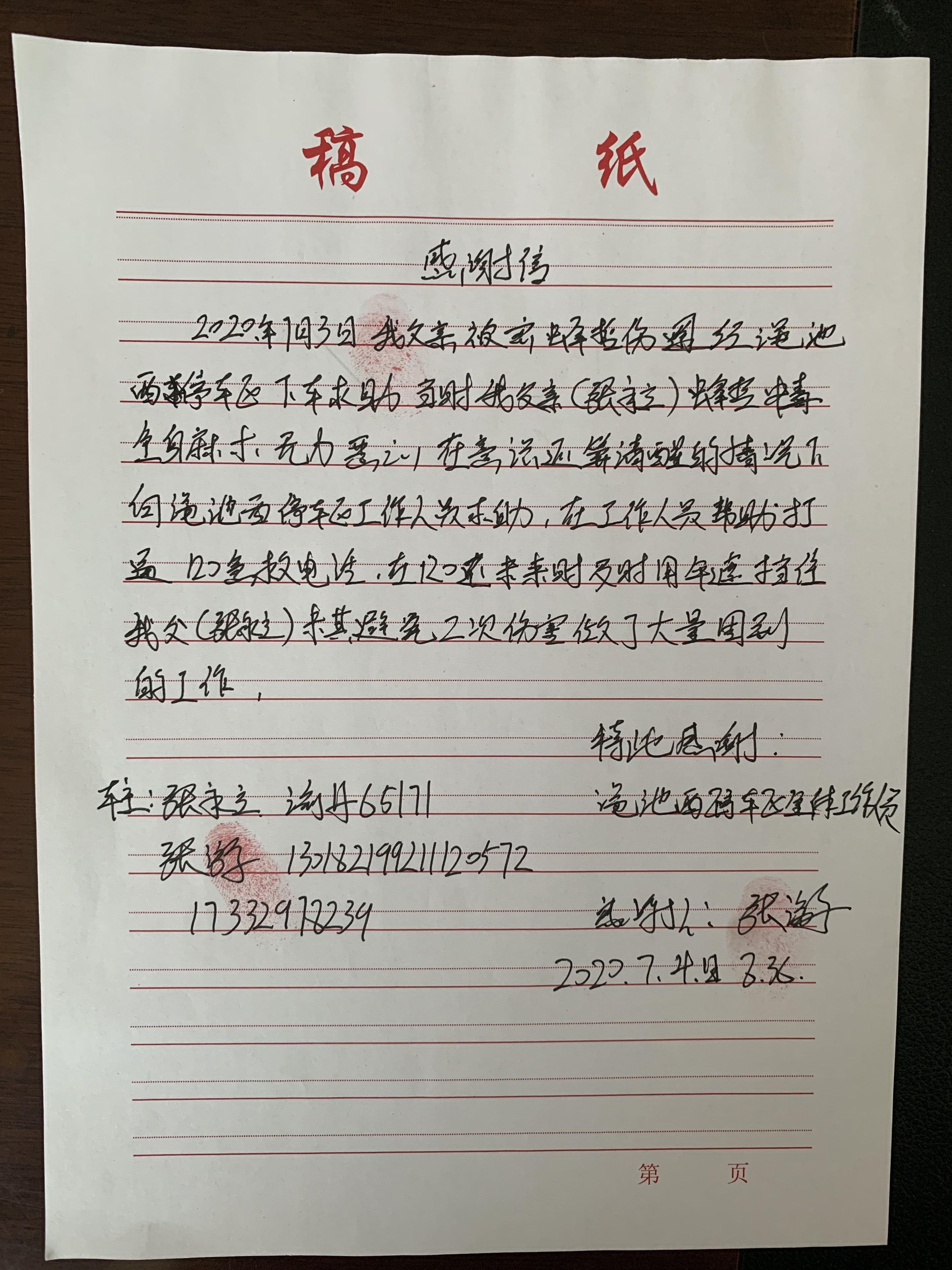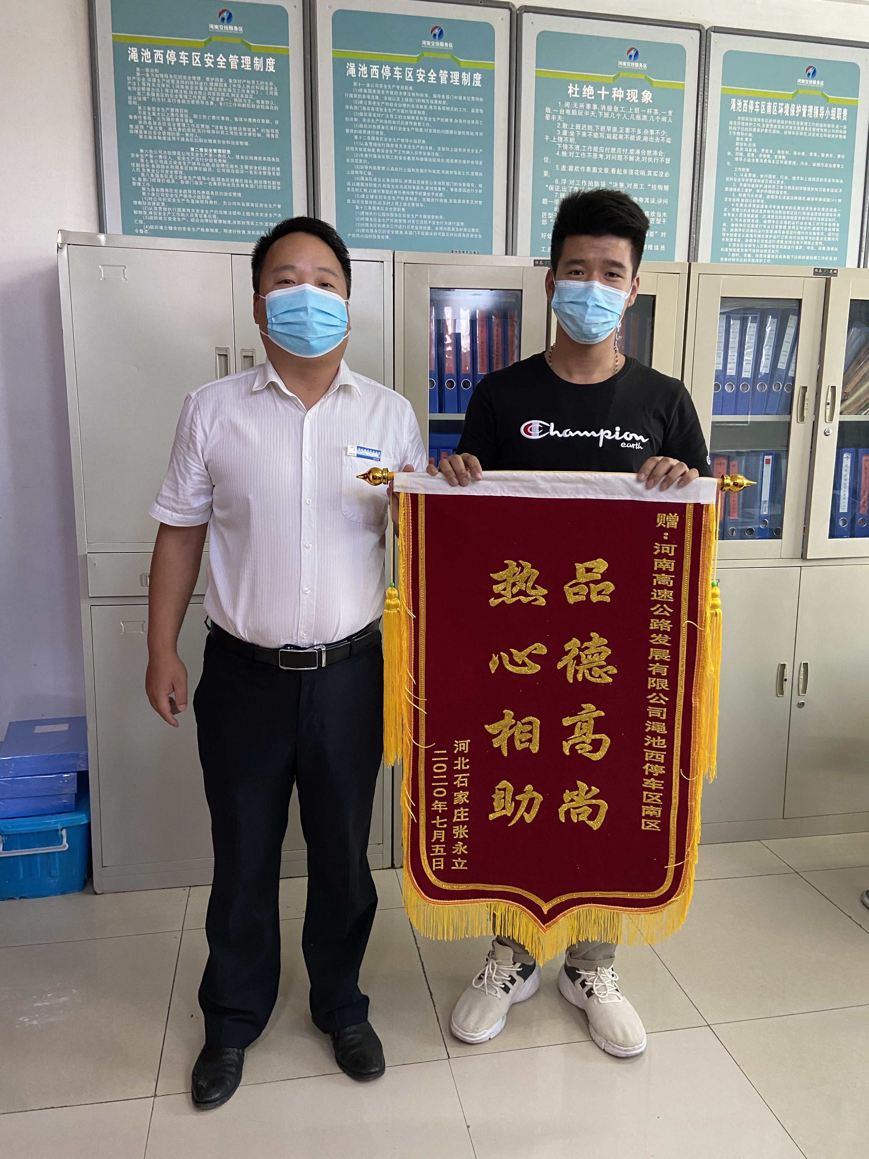 7月4日晚上,為感謝停車區(qū)救助父親的善行,病人家屬張游送來一封感切至深的感謝信,7月5日下午又將一面“熱心相助 品德高尚”錦旗送到停車區(qū)。經(jīng)其講述,父親張永立目前已脫離危險,正在留院觀察,一再交代他到停車區(qū)表達謝意。原來7月3號上午11時許,張永立獨自一人駕駛渝牌重型半掛車沿連霍高速自西向東行駛,由于車內(nèi)空調(diào)故障車窗未關(guān)閉,行駛中有一胡蜂飛入駕駛室蜇傷父親,身體隨即出現(xiàn)不適,強忍著將車開到停車區(qū)時已神智不清,下車后就暈倒到在地。談及此處,張游激動地一再說道:“你們救了我父親,救了我全家,謝謝你們!”