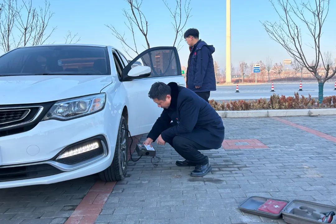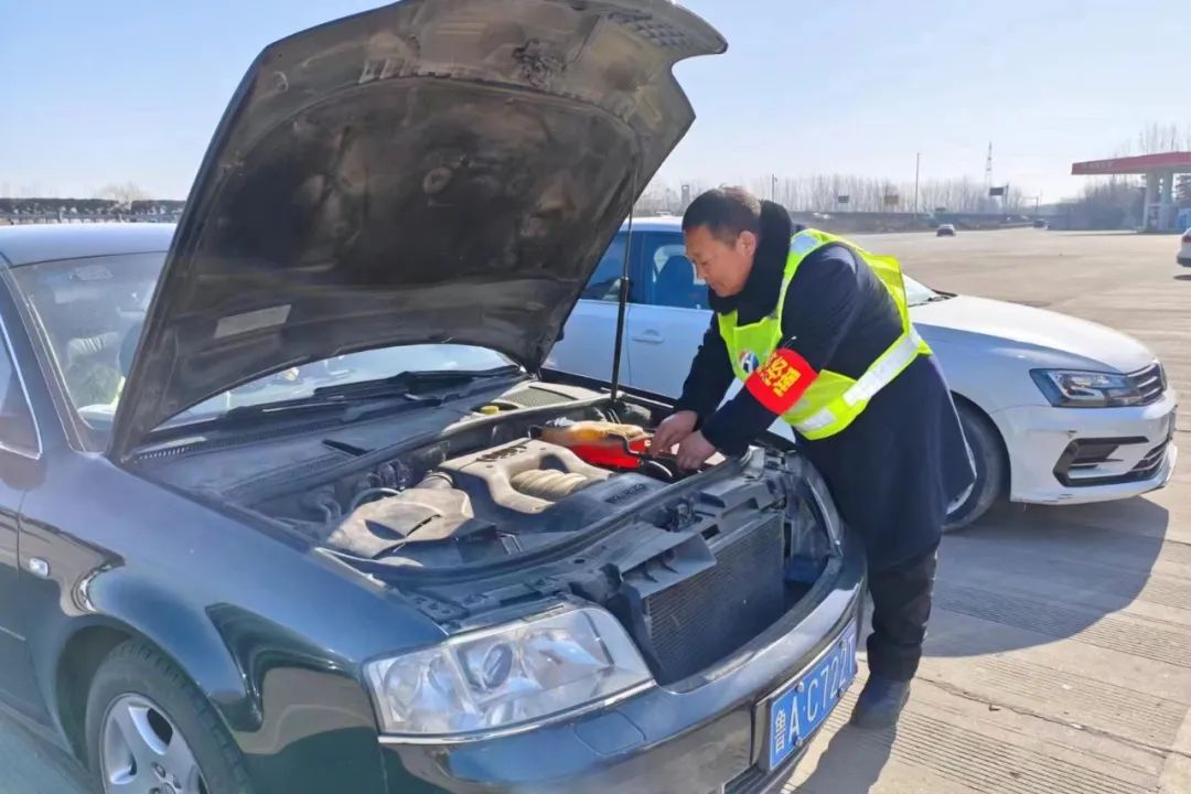 2月11日,寧陵服務區(qū)員工為過往司乘檢查汽車電瓶、機油等 確保車輛正常行駛
