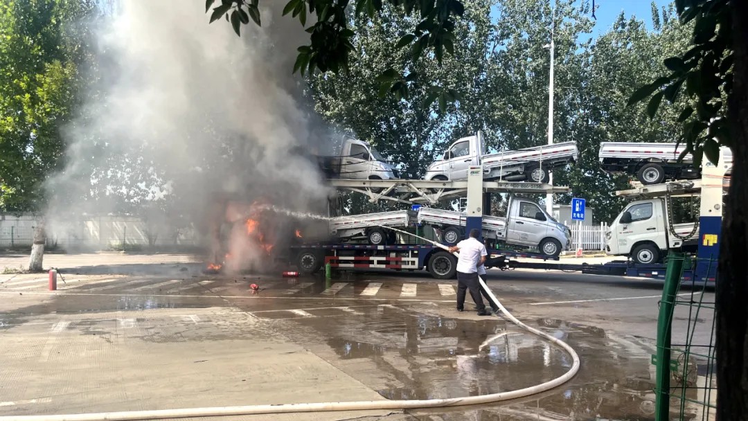 7月20日下午14:35分,靈寶服務(wù)區(qū)值班經(jīng)理在巡查時(shí)發(fā)現(xiàn)北區(qū)后廣場濃煙滾滾、一裝載有8輛小型貨車的大貨車駕駛艙內(nèi)著火并快速蔓延。