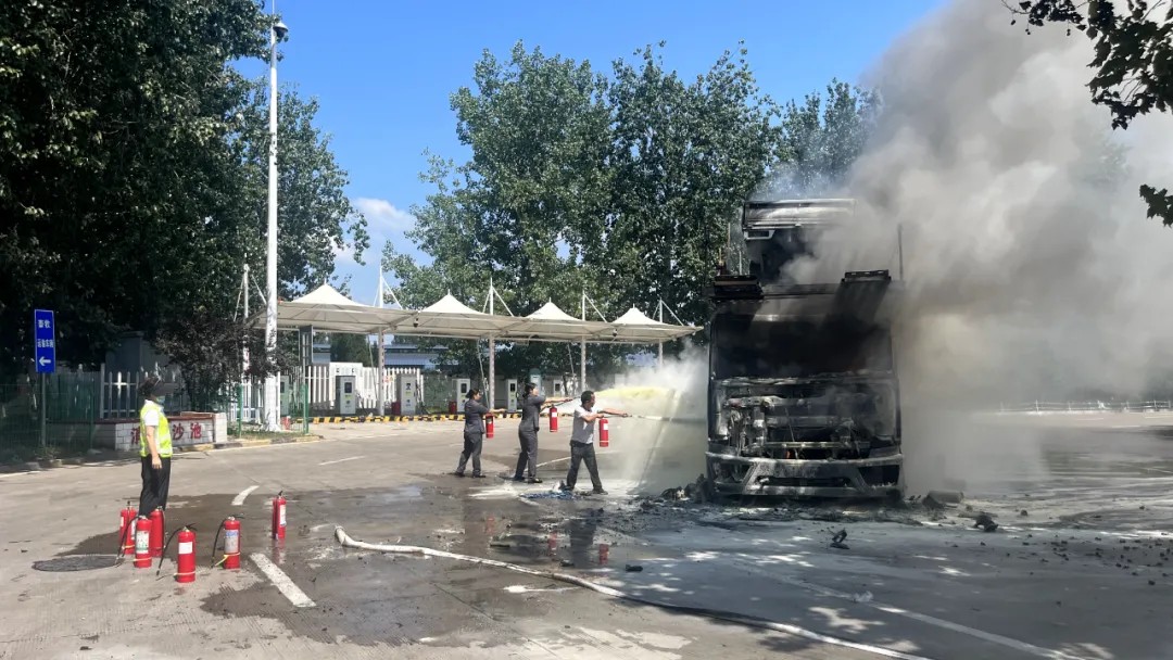 值班經(jīng)理第一時(shí)間確認(rèn)貨車司乘安全后,立即啟動(dòng)了應(yīng)急預(yù)案,撥打了119,告知周邊司乘將車輛撤離至安全區(qū)域,組織人員跑步趕至現(xiàn)場進(jìn)行滅火。救援人員通過使用干粉滅火器、消防水帶對火焰進(jìn)行噴灑,以減緩火勢的蔓延,經(jīng)過30分鐘奮力撲救,火勢終于得到控制。15:10許,119消防車輛趕至現(xiàn)場,服務(wù)區(qū)積極配合119消防救援人員直至完全撲滅火焰。